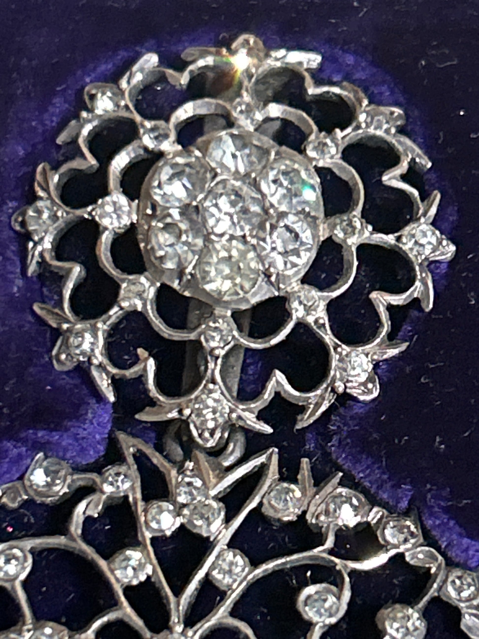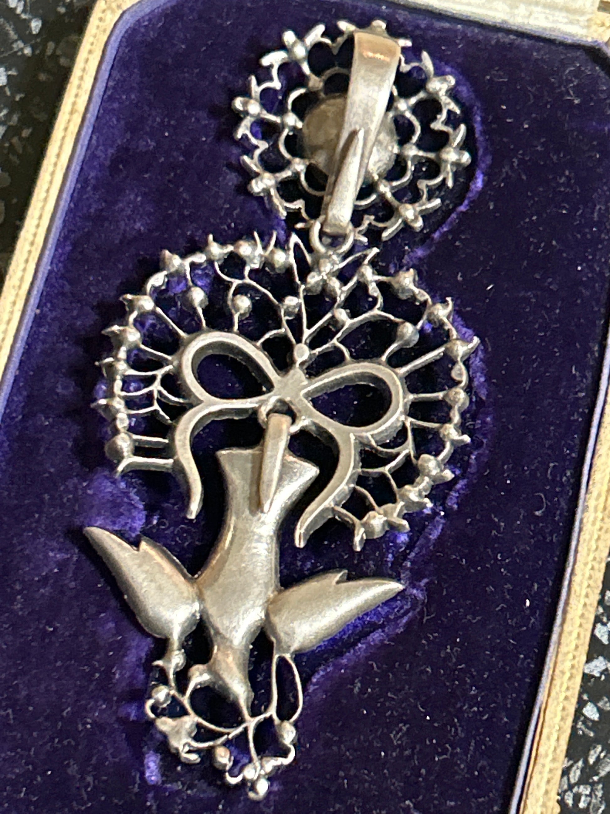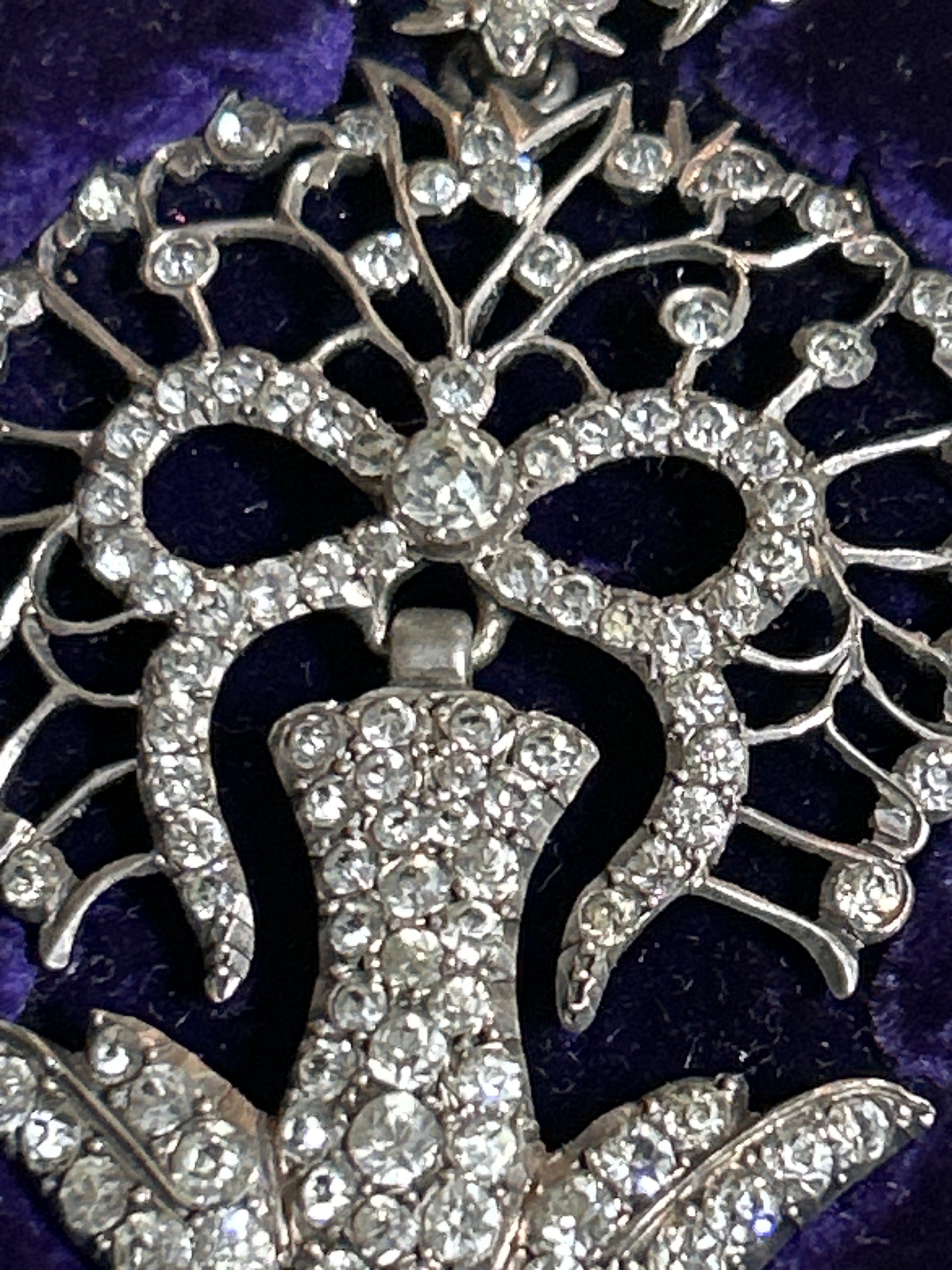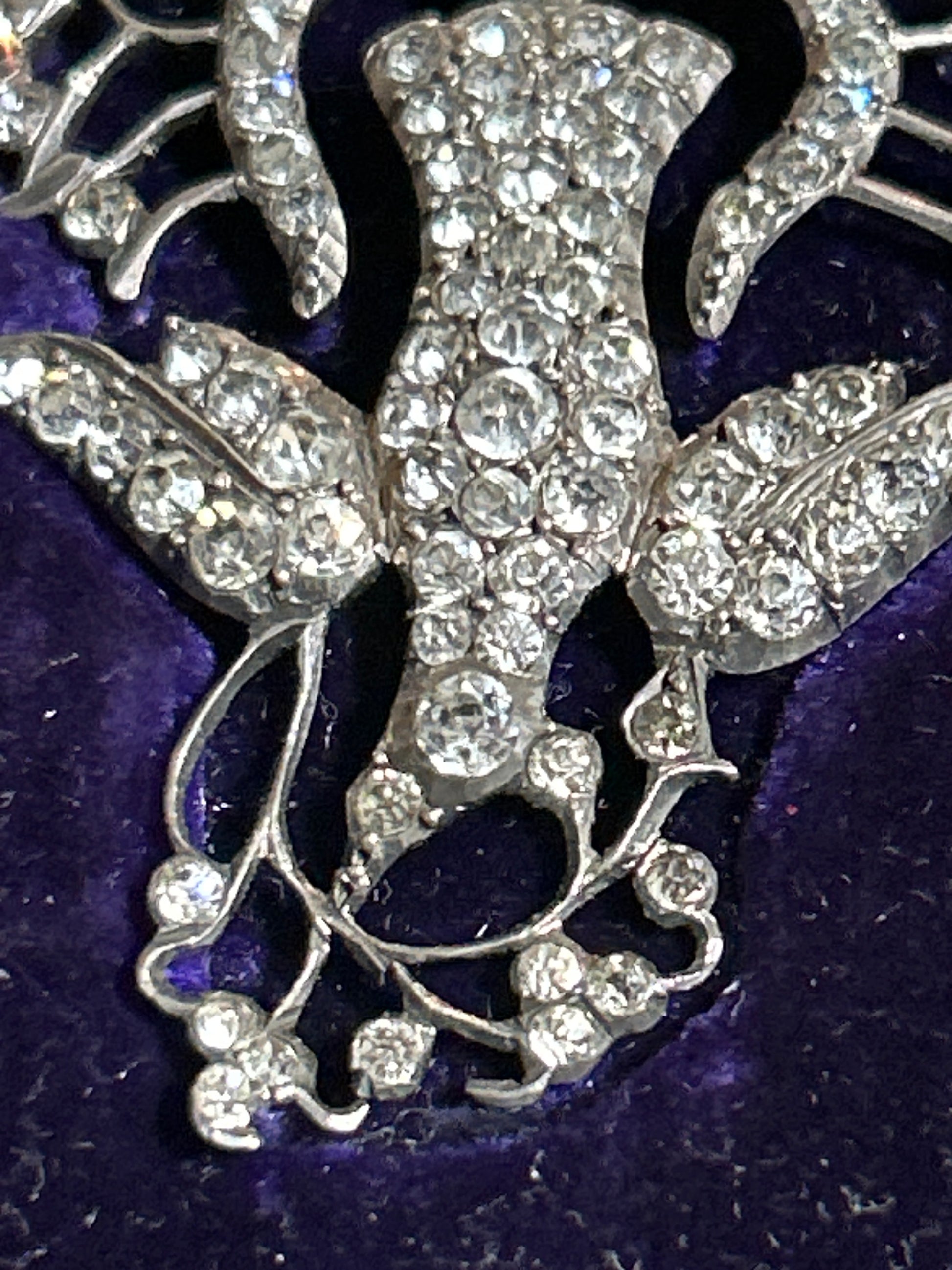 A beautiful antique silver pendant, with pretty paste rhinestones in its original purple velvet box . All stones are present and original. Stunning paste stones which are all present and bright. Couple just at the bottom near the side of the bird slightly darker. The piece is articulated separate parts . Can be worn as two separate parts. Top two half's or bottom beautiful bird. The pendant is silver, unsigned. The box which the pendant lays in is beautiful. In good condition for the age. It's a stunning purple colour. The box itself is hinged . It shuts well with a nice click. The pendant measures 3.4 inches length. This piece is French I believe . The diving dove, represents a symbol of the Holy Spirit (or Saint-Esprit), flying down to earth with a branch in its beak. As well as the Holy Spirit, it also suggests the dove which brought an olive leaf to Noah, signifying man's reconciliation with God after the Flood. This is a beautiful piece of antique jewellery . You will not find many like this especially in the original box.