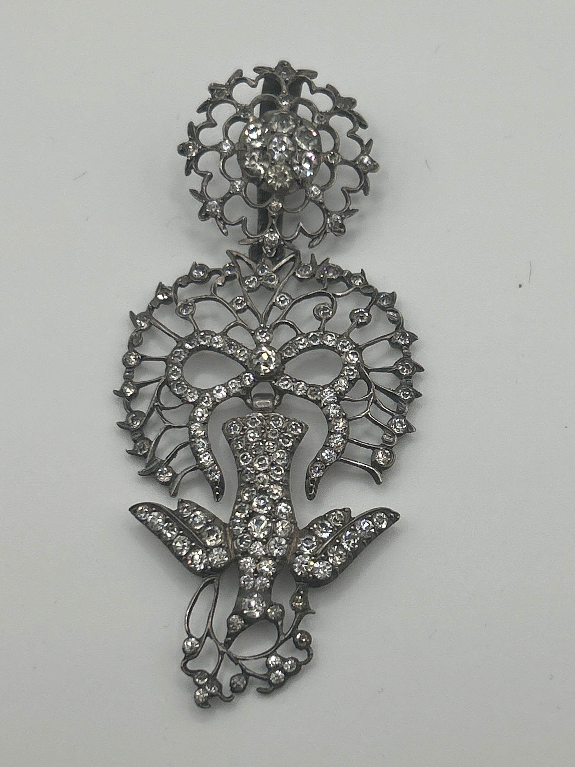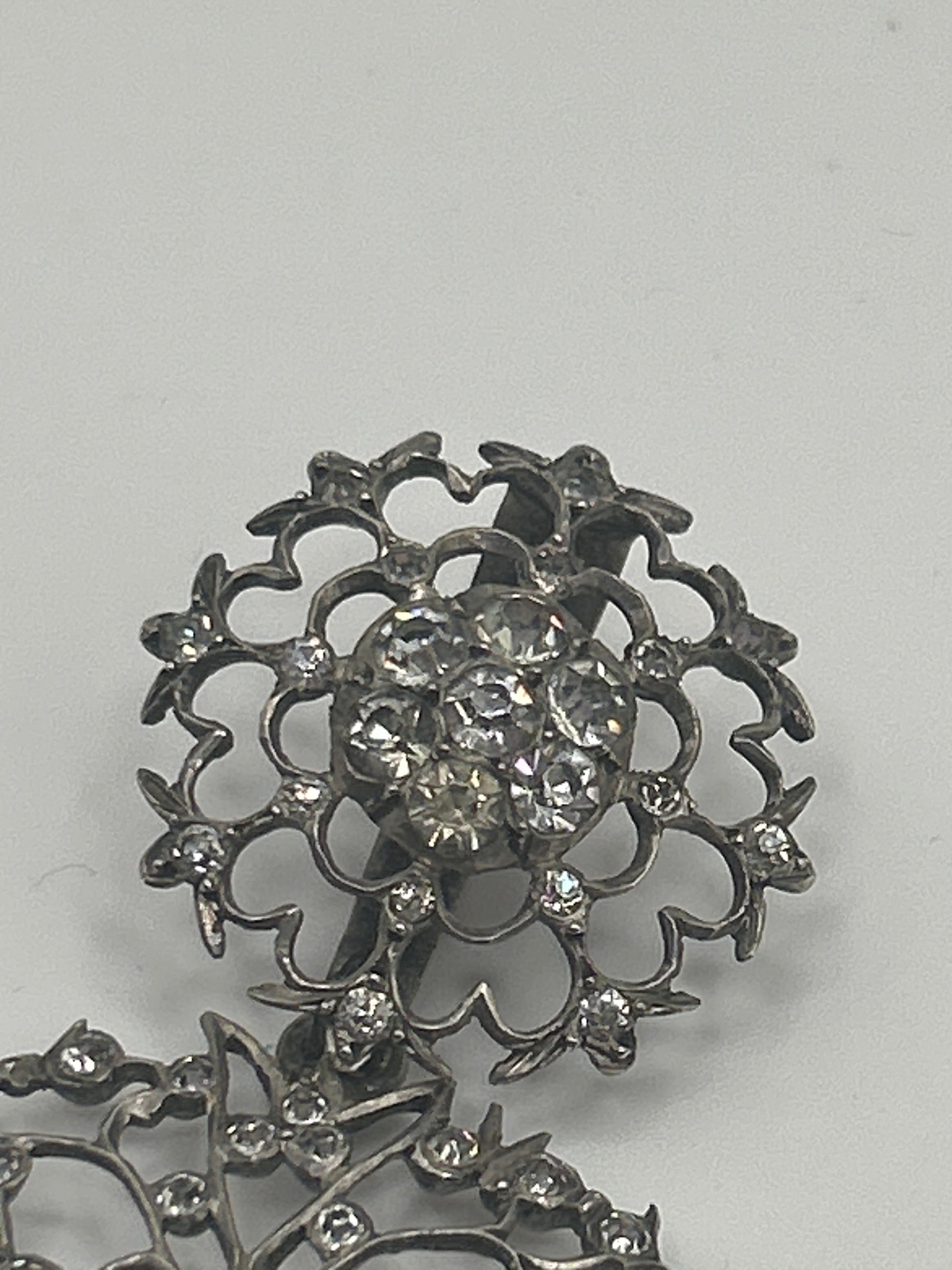 A beautiful antique silver pendant, with pretty paste rhinestones in its original purple velvet box . All stones are present and original.