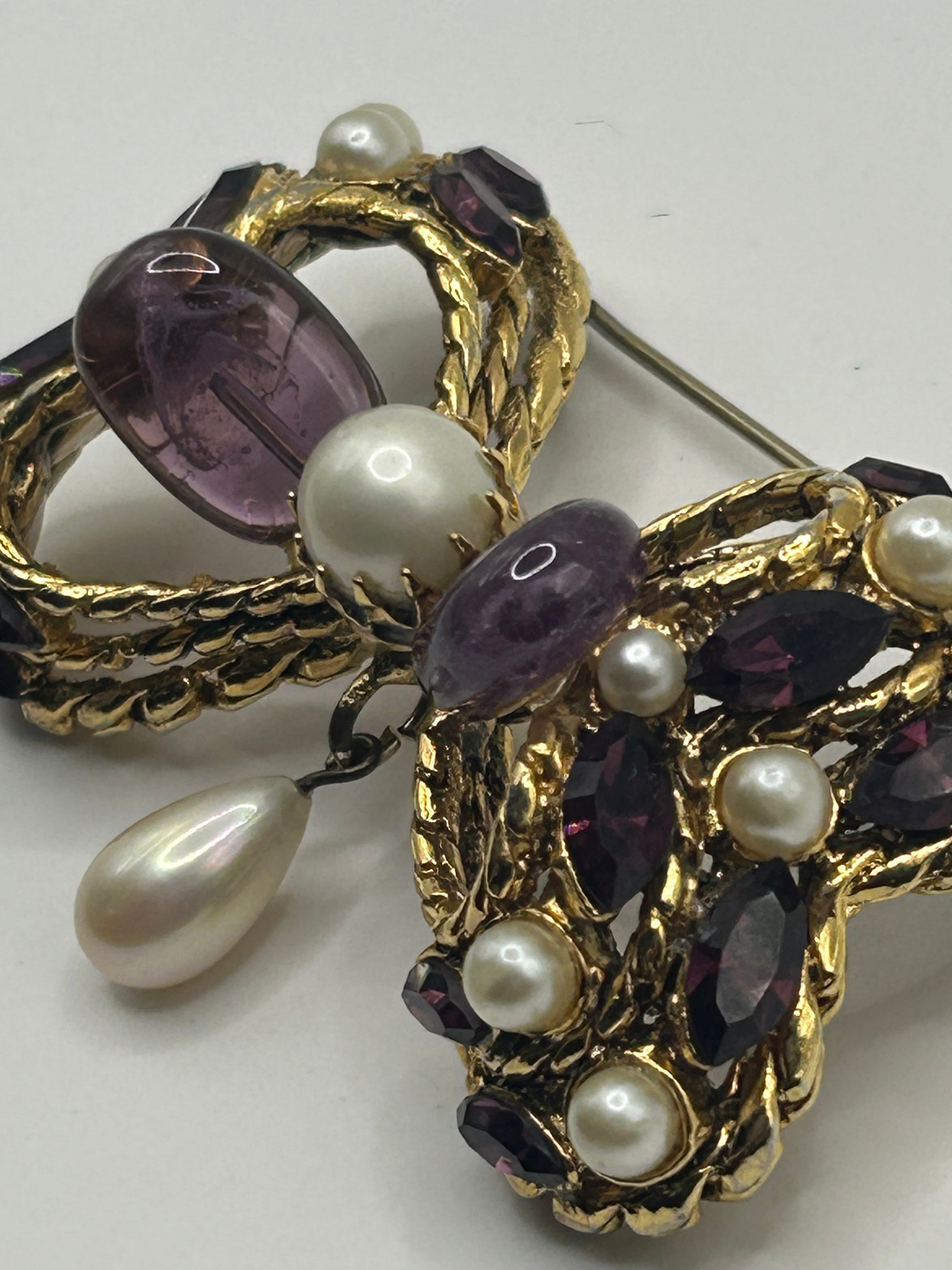 A very decorative vintage brooch with real amethyst stones, and purple glass. There are pretty faux pearls also covering the brooch.