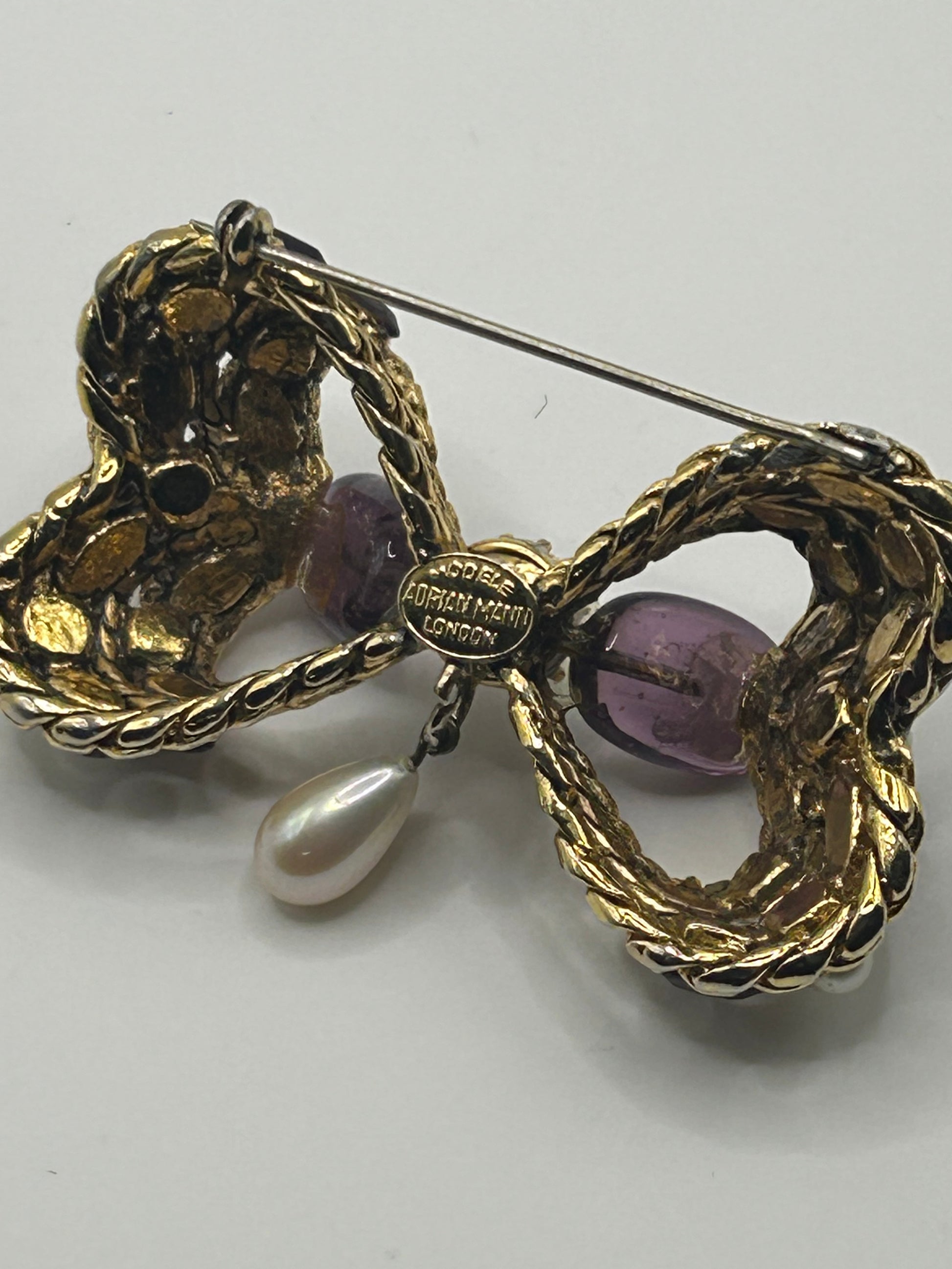Pretty Vintage Brooch Signed Adrian Mann Bow with Amethyst Stones.