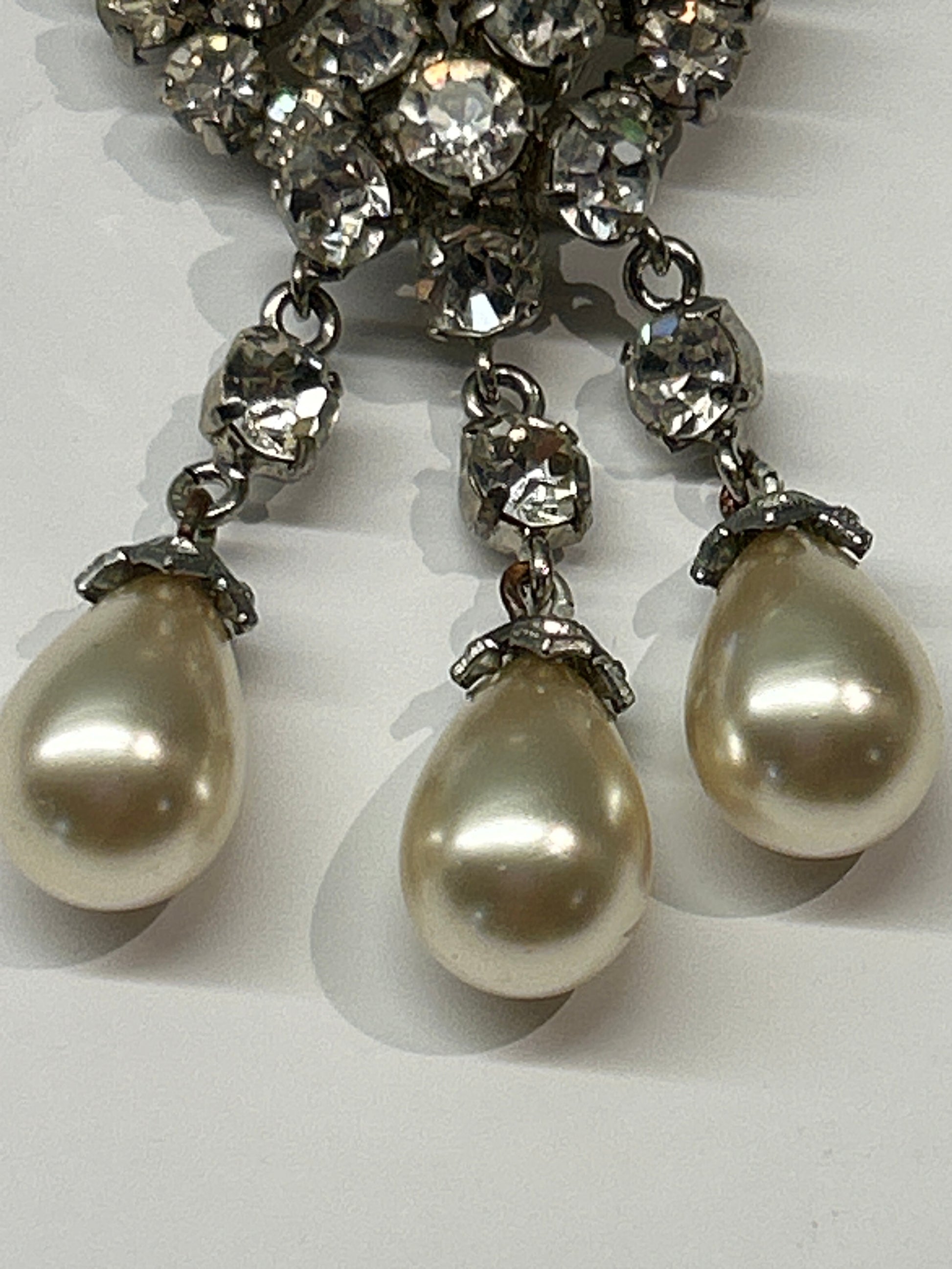 In a fabulous condition with glistening rhinestones and a pretty large faux pearl centre with three oval shaped faux pearls hanging from bottom. The centre faux pearl has few tiny marks , but nothing major.