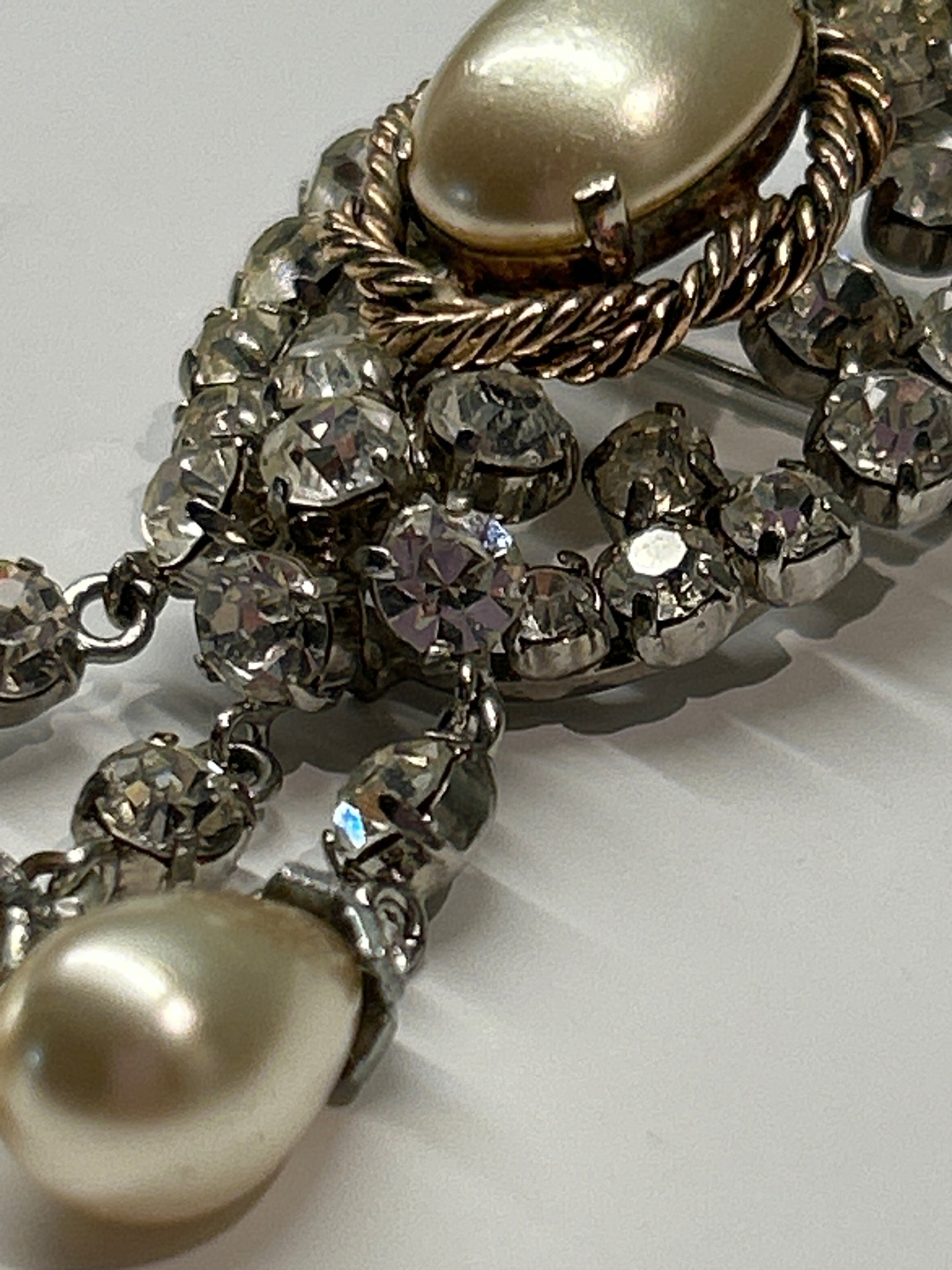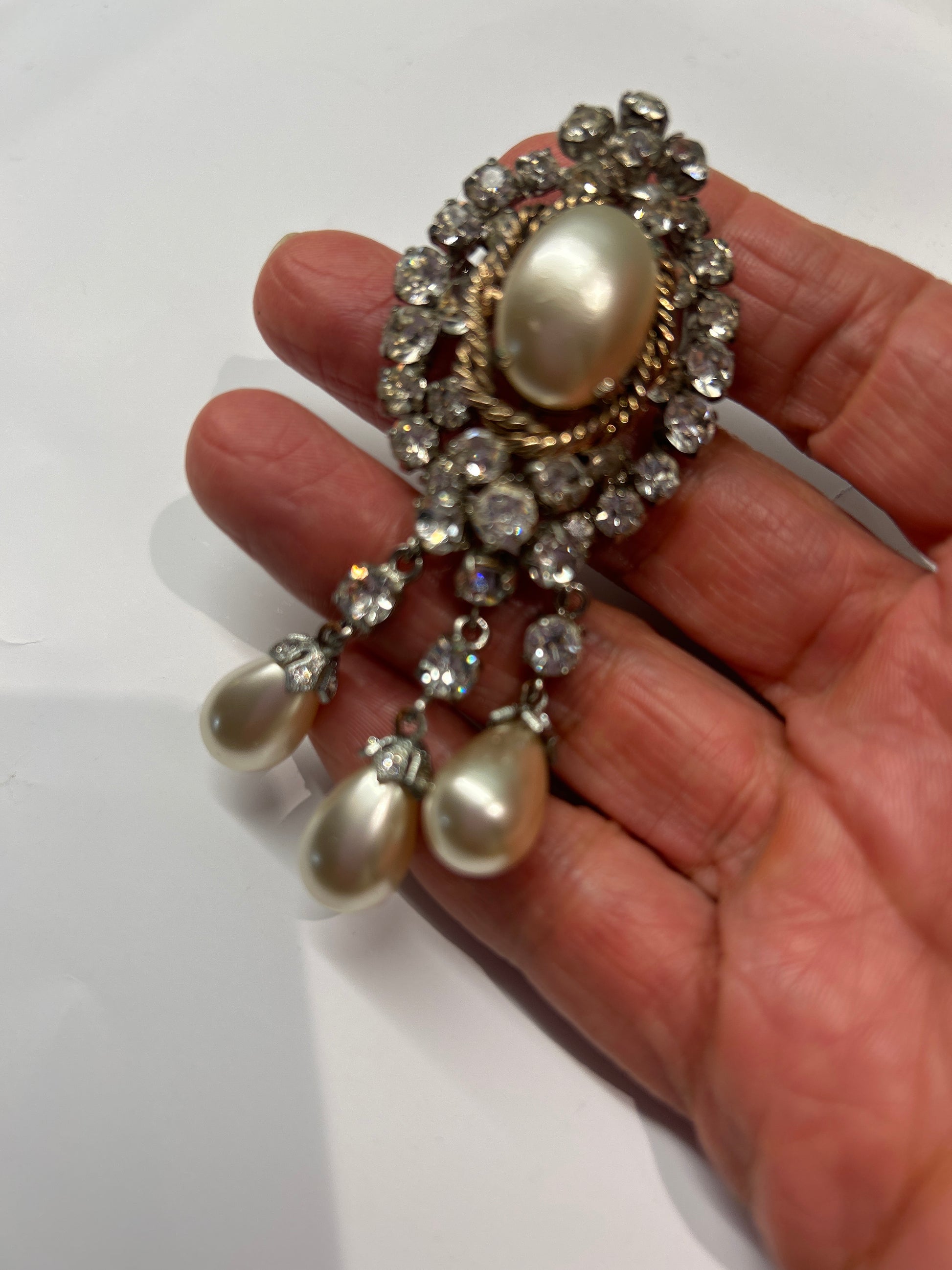 Absolutely beautiful Vintage faux Pearl Drop Dangle Brooch with stunning Rhinestones.