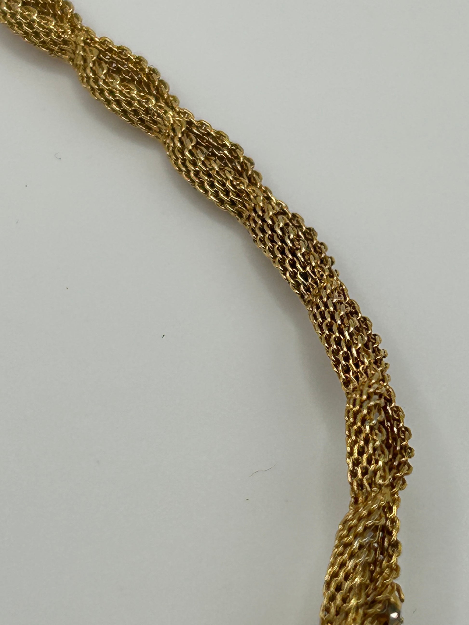 The necklace has a plaited gold coloured metal and has beautiful sparkling crystals and pearls attached . It looks really fabulous on and perfect for a special event .