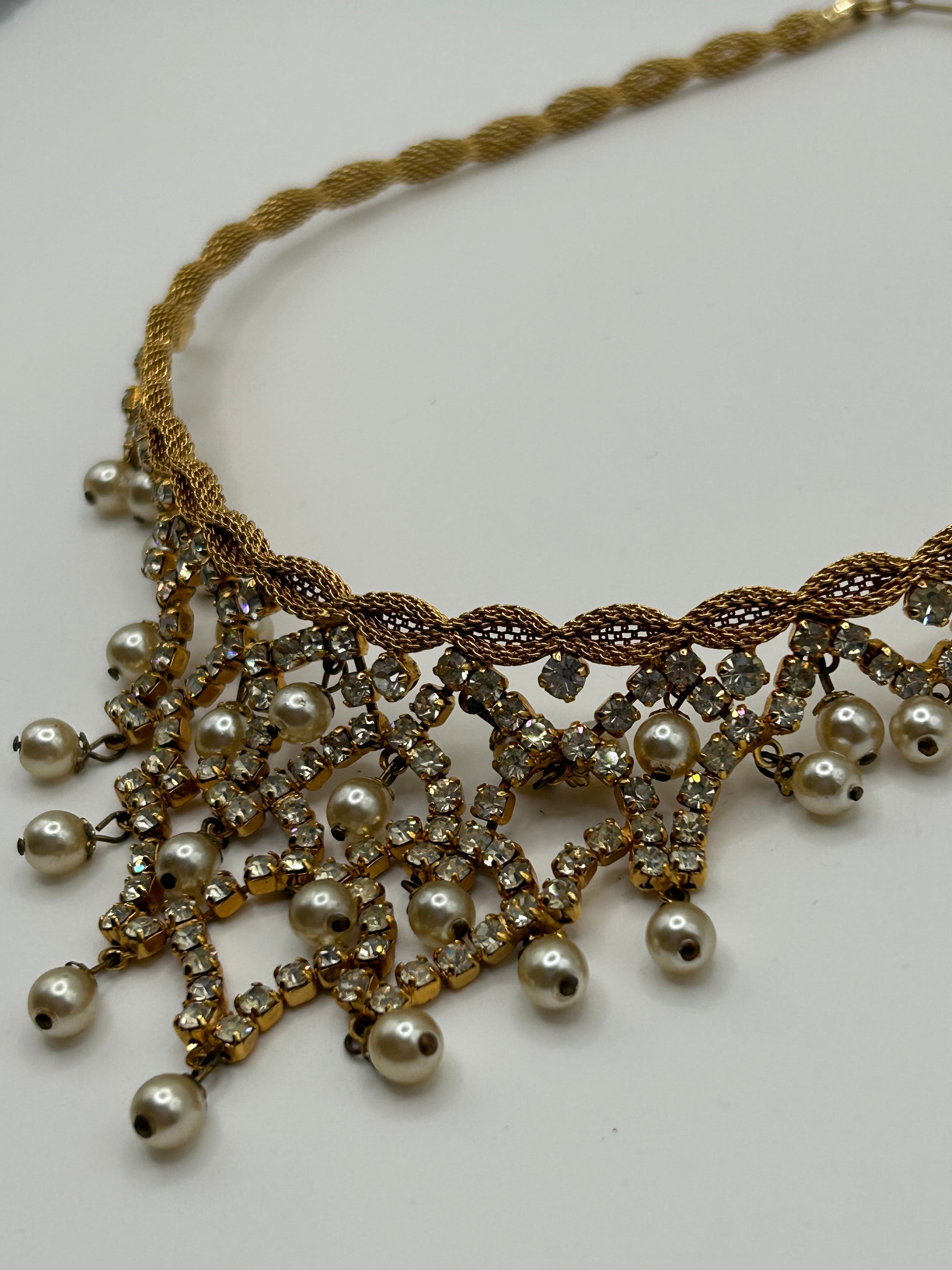 Vintage Christian Dior Crystal Pearl Bib Necklace gold Plated Rare Statement