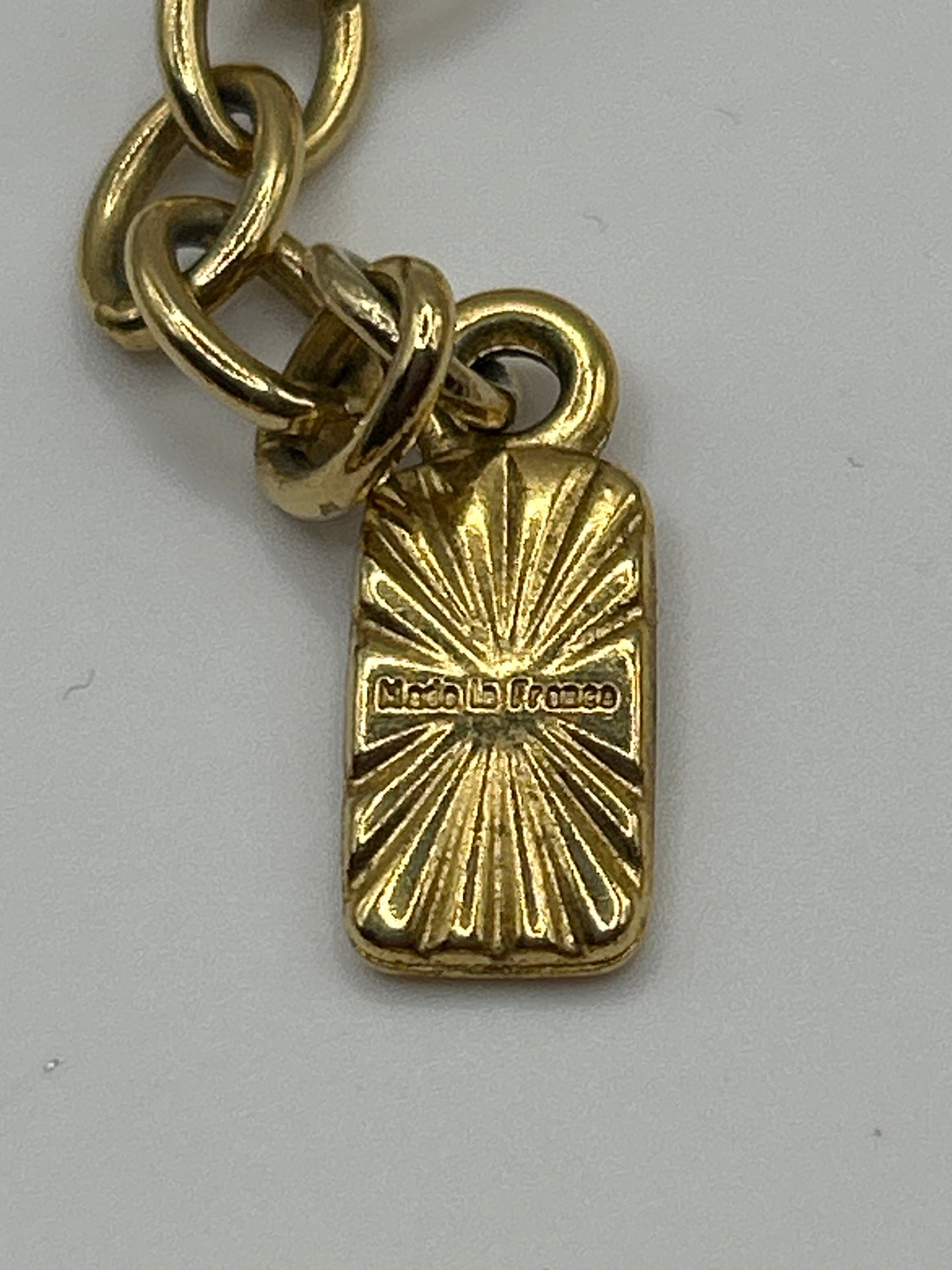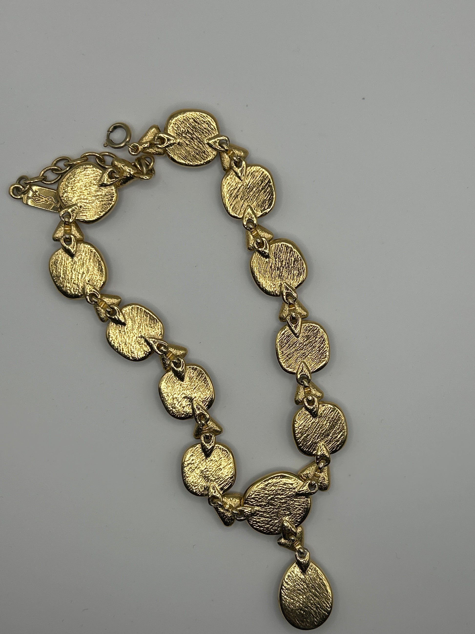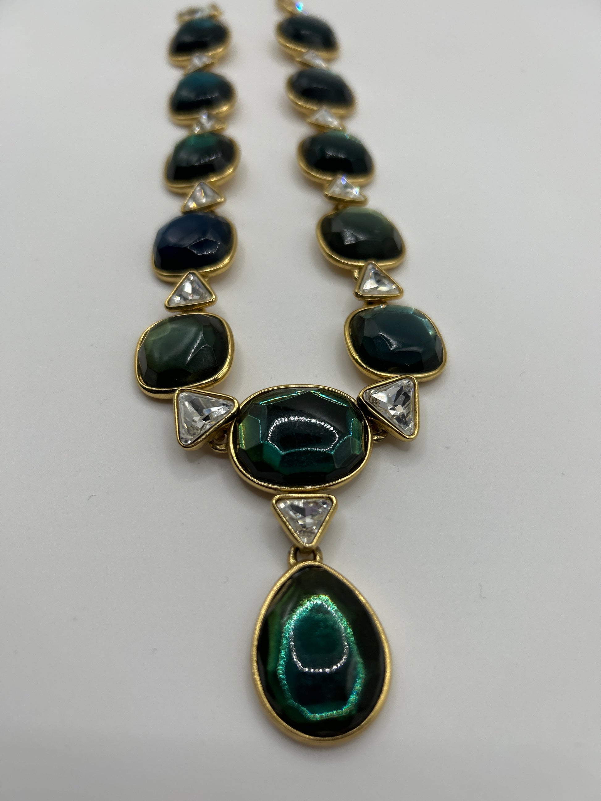 A fabulous vintage necklace from Yves Saint Laurent designed by Robert Goossens . Dating from the 1980s . This is a really is a spectacular piece. This vintage necklace is embellished with gorgeous green and blue glass stones . Each stone is has a triangle shaped clear glass crystal between. The stones are truly wonderful and look like the blue sea water . Stones are Set on a gold metal casing. The necklace has a small linked extender chain . The chain on the end has the YSL logo and made in France stamped on. The extender chain allows the necklace is be worn as a choker style or having it more lower down on the neck. It has a spring ring closure fixing. Measures for this piece are 17 inches including the extender chain . All crystals are in very good condition . |
